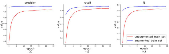There are seven categories of intention for household-registration-related questions. The specific definitions for each category are presented in Table 2. In order to explore the RBMA model’s ability to classify each intention category and the impact of text data augmentation on the model’s prediction performance, this study conducted comparative experiments on the and . The model’s prediction performance was then validated on the , and the evaluation metrics for each category were recorded. The specific data statistics are presented in Table 7. The average values of each evaluation metric and the loss function curve comparison are presented in Figure 10 and Figure 11, respectively.