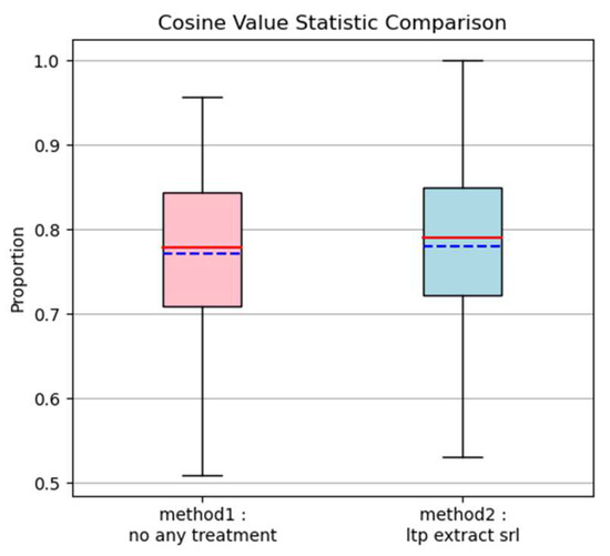 The box plots displaying the results of the two methods are presented in Figure 12. Overall, the use of LTP to extract and reorganize semantic role phrases in method (2) improved the median, mean, maximum, and minimum event entity similarity values compared to method (1). We compared the similarity values of the two methods for the same questions and found that 56.71% of the questions showed improved similarity values with the use of method (2), while 12.74% of the questions showed no change. However, 30.55% of the questions exhibited decreased similarity values after processing with method (2).
