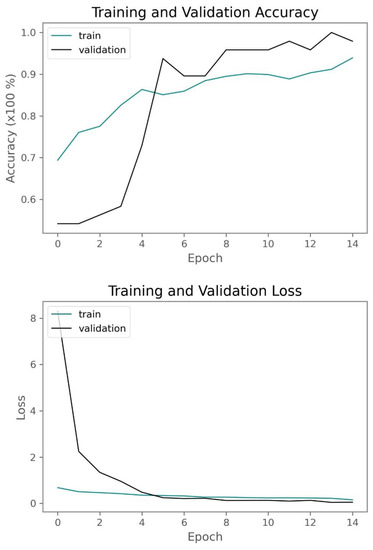 - Data Augmentation: Data augmentation is an essential training technique, even when a large amount of data are available. Data augmentation aids in overfitting reduction when the model’s performance on the training data is substantially better than on unseen data. Data augmentation creates new data points by transforming existing data points to preserve the original data information. The latter helps improve the model’s generalisation ability and performance on unseen data. As advised by similar studies [27,28,29], slight data augmentations are applied for particular classification tasks. These include slight height and width shifts (by 10 pixels), random rotations (by a maximum of 10 degrees), and Gaussian noise injections.