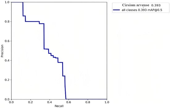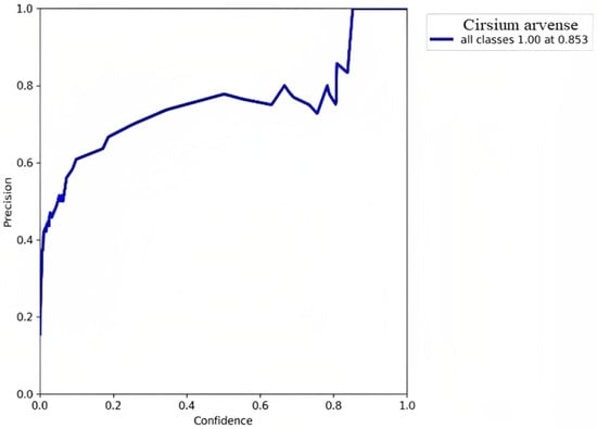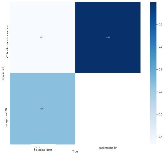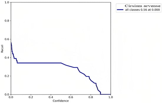 Recall is computed by multiplying TP by the sum of TP and FN. Recall is also known as sensitivity and the true confident rate (Equation (2)). Its value is between 0 and 1. The effectiveness of the neural network in weed detection was evaluated using recall.