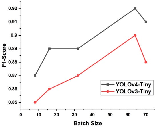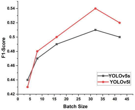 Figure 7 demonstrates the results of evaluating two different neural network models, YOLOv5s and YOLOv5l, on a classification task using five different batch sizes (42, 32, 16, 8, and 4). The evaluation metric used in the figure is the F1-score. In general, the results in Figure 7 show that the YOLOv5l model tends to have a higher F1-score compared to the YOLOv5s model, especially when using larger batch sizes (32). Further, the performance of the model is reduced if the batch size used in the model training is bigger than 32. Furthermore, using a smaller batch size can lead to less stable training, and may result in the ideal overfitting to the preparation records, resulting in a lesser performance.