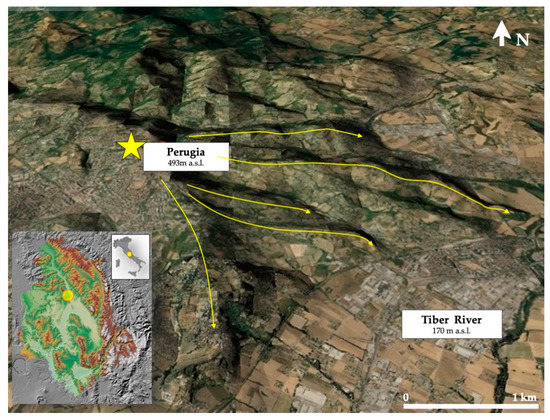 - Bizzarri, R.; Melelli, L.; Cencetti, C. Archaeo-geosites in urban areas: A case study of the etruscan Palazzone Necropolis (Perugia, central Italy). Alp. Mediterr. Quat. 2018, 31, 1–12. [Google Scholar]