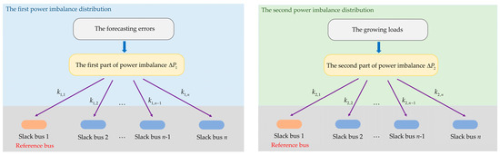 - The first power imbalance allocation: the power imbalance source is the power forecasting errors. More specifically, the power forecasting errors are modeled as having a Gaussian distribution in Section 2.3. When LHS is used to sample from the distribution of random variables, each sampling value is different, which corresponds to the fluctuation of renewable energy generation and load power. This will lead to the power imbalance, which is relatively small. Therefore, the generator power adjustment process is similar to the secondary frequency regulation in the power system. For this kind of power imbalance, power allocation is performed according to the ratio of the remaining capacity of each generator amongst multi-slack buses.