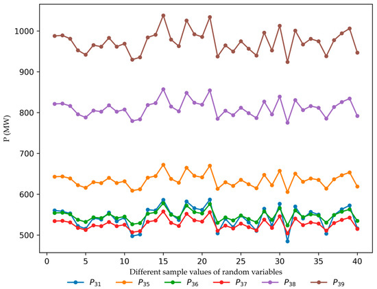 - Obtain the reference value of power system loss by a power flow calculation under the mean value of all random input variables. The active power equation of power flow equations is as follows:where N is the number of buses; is the active power of generator at bus i; is the active power of load at bus i; Ui is the voltage amplitude of bus i; is the phase angle difference between bus i and bus j; and Gij and Bij are the real part and imaginary parts of the bus admittance matrix, respectively.