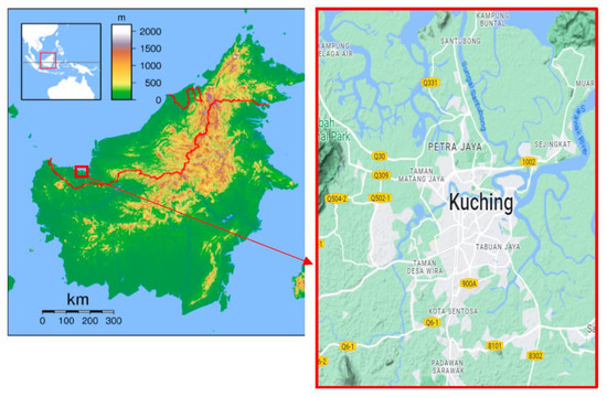 Kuching City, shown in Figure 1, experiences an average annual rainfall of 4096 mm, with the highest monthly distribution reaching 485.4 mm [16]. Daytime temperatures in Kuching range from 23 to 32 °C [4]. The weather in Kuching is influenced by various factors, including the Madden–Julian Oscillation (MJO), El Niño–Southern Oscillation (ENSO), monsoons, and the Indian Ocean Dipole (IOD) [5]. The northeast monsoon season occurs from November to February, while the northwest monsoon occurs from May to September, resulting in relatively dry weather during this period [5]. The monsoon transition occurs in April and October. Kuching City was selected as the study location due to the significant impact of El Niño events in 1982–1983 and 1997–1998, which led to a 25–28% reduction in rainfall and prolonged droughts. Mahmud [17] also reported a 40% decrease in rainfall from May to October 1997 compared to the normal monthly average.