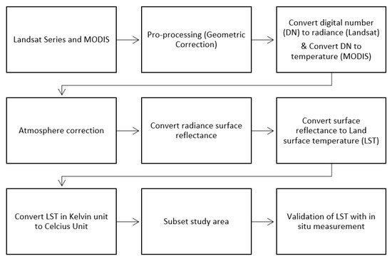 In addition to RS data, daily air temperature data from the Kuching Airport station were collected. The temperature measurements were recorded at latitude 01°29′ north and longitude 110°20′ east. The data, provided in °C, included minimum, maximum, and average monthly temperature values calculated from daily measurements. The meteorological data from the Malaysia Meteorology Department (MMD) covered the period from 1988 to 2019. These data served as a reference to evaluate the accuracy and effectiveness of RS data in studying the impact of ENSO on the temperature in Kuching City, Sarawak. The RS data required preprocessing, including geometric, radiometric, and atmospheric corrections, before converting the digital numbers to land surface temperature, as mentioned in Figure 2. The conversion process follows the method applied by Kemarau and Eboy [22].