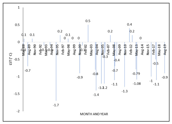 Referring to Figure 3 there are differences in daily temperatures between the MMD data and the daily temperatures derived from the Landsat satellite. This study found the largest difference in December 1995, with a negative (−) 1.7 °C difference. The second-largest difference occurred in August 2004, with a negative (−) 1.4 °C difference, followed by negative (−) 1.3 °C in February 2011 as well as negative (−) 1.2 °C in September 2005 and October 2005. These differences arise because RS sensors, such as Landsat and MODIS, measure surface temperature, while meteorological stations measure air temperature [43].