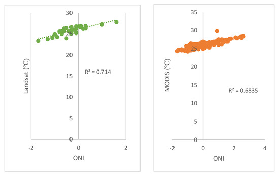The correlation between land surface temperature (LST) derived from Landsat, LST from MODIS, and the Oceanic Niño Index (ONI).
