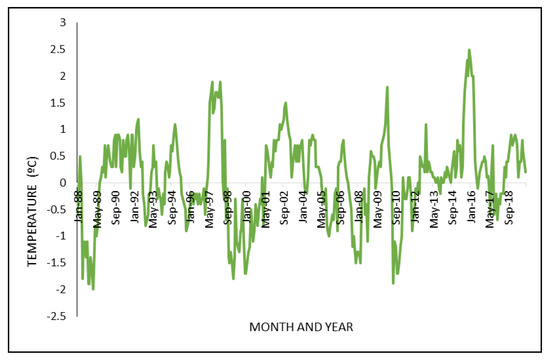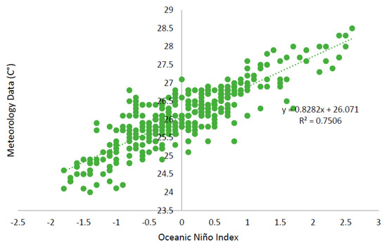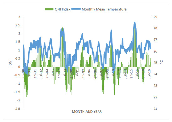 The temporal pattern of the ONI and air temperature, representing the average monthly temperature in Kuching City from 1988 to 2019, is shown in Figure 5. As depicted in Figure 6, a positive relationship between the ONI and monthly temperature from MMD is observed. From May 1988 to May 1989, the ONI values ranged from −1 to −1.8, resulting in a decrease in temperature from 24.8 °C to 24 °C. Negative ONI values indicate the occurrence of La Niña events, observed in December 1999, 2007, and 2010. In contrast, during El Niño events spanning from June 1997 to April 1998, the recorded ONI was 0.88, leading to an increase in temperature from 26.48 °C to 27.9 °C. A similar phenomenon recurred from late 2015 to March 2016. El Niño events also occurred in 1991, 1997–1998, and 2015–2016 [13,14,15].
