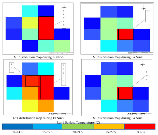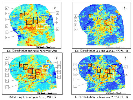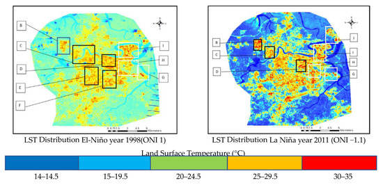 To gain a clearer understanding of the areas experiencing higher temperatures, the study categorizes them into urban and industrial zones. In Kuching City, Sarawak, there are more clustered heat areas during El Niño compared to La Niña. For instance, during El Niño, almost all of the zones (B, C, D, E, F, G, H, I, and J) exhibit temperatures above 30 °C [31], causing discomfort to the population in Kuching City, as shown in Figure 8. Another example is illustrated in Figure 6. During El Niño, there are a total of eight focal point hot zones: B, C, D, E, and F (urban areas) and G, H, and I (industrial areas), while during La Niña, there are seven zones: B, C, D, G, H, I, and J. Figure 5, Figure 6 and Figure 7 demonstrate the increase in the area of concentrated heat where the temperatures exceed 30 °C, during both La Niña and El Niño events.