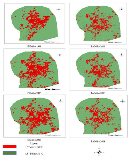 By leveraging remote sensing (RS) technology and Geographic Information Systems (GISs), our understanding of ENSO effects and their spatial distribution can be improved, contributing to effective mitigation strategies and informed decision making. This information is valuable for various responsible entities, including disaster management departments, national councils, charities, local governments, and the Ministry of Health. Accurate spatial data on areas with temperatures above 30 °C, which can make humans uncomfortable [5] (hotspot areas), can aid city planners and local governments in predicting and implementing infrastructure measures, such as green and blue areas, to mitigate the impact of El Niño on surface temperatures and urban climates. The findings of this study can serve as a reference for policymakers and agencies involved in disaster management and healthcare to develop targeted measures during ENSO events. RS and GIS capabilities in mapping hotter areas and cold spots in urban areas provide valuable information for policymakers and agencies to provide assistance. Enhancing our knowledge on the extent of ENSO’s impact on temperature enables us to better plan land development and conduct research on climate change [5,6].