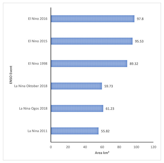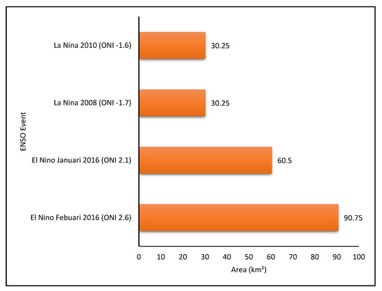 Based on Table 6, the average temperatures during the El Niño events in 1997 and 1998 were 27.8 °C and 26.9 °C, respectively, while the average temperature during the La Niña events in November 2011 and September 2010 was 24 °C. This indicates a temperature difference of 2 to 3 °C between the ONI events. Kemarau and Eboy [36] state that rainfall decreases during El Niño events, which can lead to an increase in temperature, while high rainfall during La Niña events causes a decrease in temperature in Kuching City. Kemarau and Eboy [5,36] report that the effect of El Niño can cause a temperature increase ranging from 0.5 °C to 1.5 °C, while La Niña can cause a temperature decrease ranging from 0 °C to 1.2 °C. This explains why the extent of hotter areas during El Niño events is higher compared to that during La Niña events.