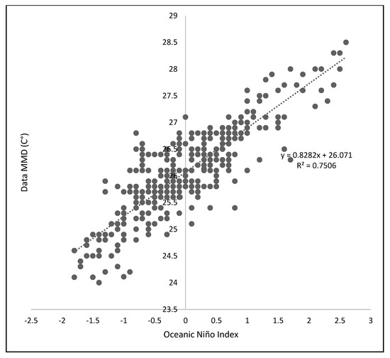 Direct correlation between ONI (Oceanic Niño Index) and air temperature from MMD over three months based on the ONI formula.