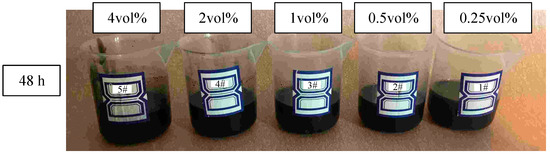 To improve the mechanical properties of the polymer matrix, the surface modification of the SWCNTs is needed to improve its dispersion. The existing modification technologies can be roughly divided into two categories: covalent functionalization and noncovalent functionalization [21]. In this paper, noncovalent functionalization is used to modify the surface of the SWCNTs. Two-component room temperature vulcanized silicone rubber (RTV) is used as the matrix material, which consists of rubber (component A) and a cross-linking agent (component B). SWCNTs are used as the reinforced phase, and tetrahydrofuran (THF), which is a volatile solvent, is used as the dispersant. RTV-SWCNTs composites with SWCNT volume contents of 0.25 vol%, 0.5 vol%, 1 vol%, 2 vol%, and 4 vol% are prepared, respectively. Each SWCNTs-A solution is treated in a static state to observe whether there is precipitation in the solution and to preliminarily judge the dispersion of the SWCNTs in the RTV. The SWCNTs-A solution samples standing for 48 h are shown in Figure 2.