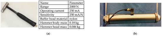 The modal experiment generally uses a hammer or the exciter as the excitation device. The experimental object in this paper is the BHP, which belongs to light and small equipment. The hammer is used as the excitation equipment and its specific technical parameters are shown in Figure 6a. Considering the effect of the oil on the pipeline, the oil is sealed in the pipeline. And the BHP filled with oil is suspended by a string with small rigidity. The acceleration sensor is stuck to the middle of the pipeline, as shown in Figure 6b. Then, the left end (inlet end) of the pipeline is knocked by the calibrated hammer to produce the frequency response curve.