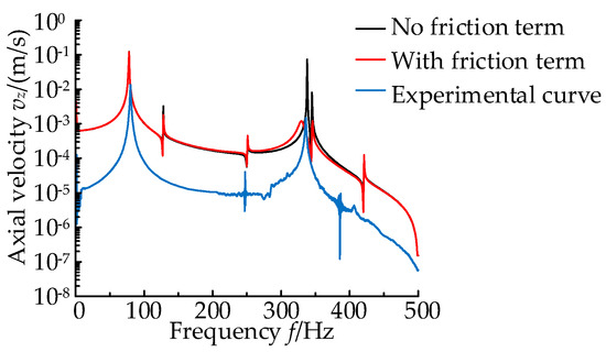 It can be observed that the frequency corresponding to each peak in the curve is the natural frequency of the BHP. By comparing the axial velocity response curve for the BHP with/without friction terms, it can be seen that friction coupling does not affect the resonant frequency, but affects its resonant peak.