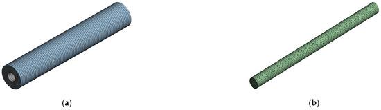 To study the influence of different types of BHP on the vibration of the pipe wall when the flow pulsation is the same, the bidirectional FSI analysis for the BHP is carried out in the ANSYS Workbench software. The grid division of the solid and fluid regions is shown in Figure 8. The structural parameters and fluid parameters are shown in Table A1; where, the parameters for the RTV are C01 = 1.213 MPa, C10 = −0.01679 MPa. The standard k-ξ turbulence model is adopted for the fluid, the wall shear force in the BHP with RTV as the elastic layer is the wall shear force in the Brunone model, and the inner wall of the BHP with RTV-SWCNTs composite materials as the elastic layer is set as the smooth wall. The boundary condition for the pipeline inlet is set as the flow pulsation at the outlet of the axial piston pump, as shown in Figure 9. The pipeline outlet is set as the pressure outlet and the pressure is set as 2 MPa.
