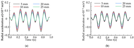 Effect of the length of the elastic layer on the radial acceleration at point P. (a) RTV as the elastic layer; (b) RTV-SWCNTs composite materials as the elastic layer.
