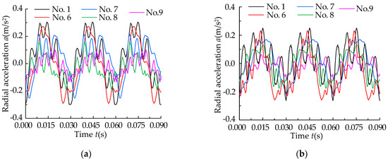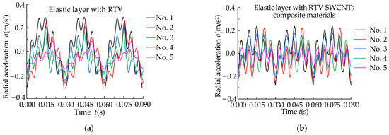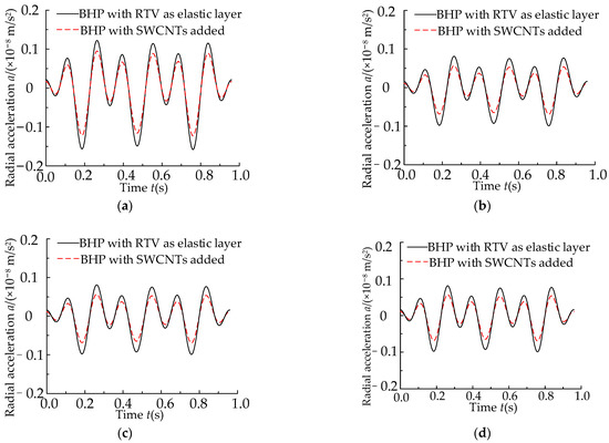 In Figure A4, it can be seen that the radial acceleration at point P in the three-layer BHP with RTV-SWCNTs composite material as the elastic layer is significantly lower than that of double-layer BHP with RTV as the elastic layer. The data on the vibration suppression effect in the BHP with different thicknesses of the elastic layer is shown in Table 10.