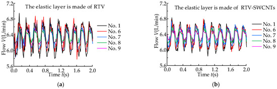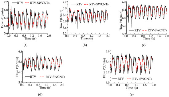 Effect of different materials on flow pulsation with the same length of the elastic layer. The length of pipeline is: (a) 130 mm; (b) 180 mm; (c) 230 mm; (d) 280 mm; (e) 330 mm.
