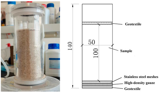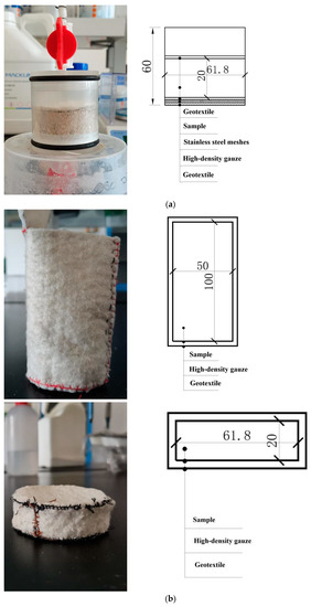 After drying, the soil sample is compacted into three layers and loaded into a mold. The peristaltic pump and air compressor are grouted with a cylindrical model made of acrylic material. The two ends of the mold are equipped with threaded covers, on which liquid inlet and outlet holes are reserved (Figure 3a). The soaking group adopts a complete contact flexible mold with white geotextile material for the outer layer and high-density gauze for the inner layer. Once the soil sample is filled, the top cover is sewn shut with a needle and thread (Figure 3b).