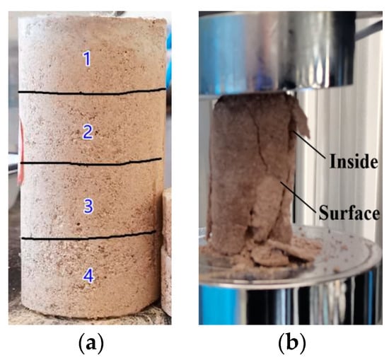 The soil samples injected by the peristaltic pump and air compressor were divided into four equal parts according to their height for calcium carbonate content determination; then, the content of calcium carbonate in the solidified soil samples (from the surface 2 cm and inside) was measured with the soaking method, as shown in Figure 5. To prepare the samples, they were ground into powder and dried. Three 10 g soil samples from each part were taken and titrated with 1 mol/L hydrochloric acid until no bubbles formed for half an hour. The remaining soil mass was then weighed.