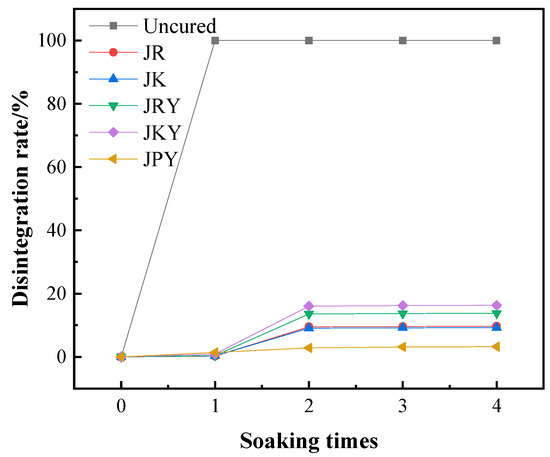In consideration of the susceptibility of Wuyishan granite residual soil slope to landslide disasters in the event of heavy rainfall after prolonged sun exposure, two soil samples (before and after strengthening) were dried at 60 °C until reaching a constant weight. Subsequently, the samples were soaked in water until disintegration ceased, followed by another round of drying and weighing of the residual mass. This process was repeated four times to complete the disintegration test.
