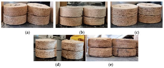 Soil samples solidified with different grouting methods: (a) JR; (b) JRY; (c) JK; (d) JKY; (e) JPY.