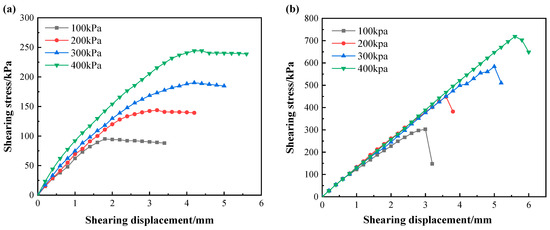 The soil samples are dried for 7 days at room temperature after strengthening, and the shear stress and UCS are measured according to the Chinese National Standard for Soil Test Methods (GB/T50123-2019) [28]. The shear stress is measured under 100–400 kPa vertical pressure with a shear rate of 0.8 mm/min.
