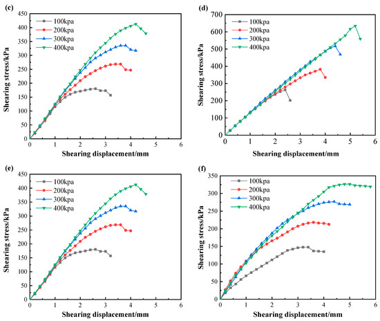 Shear stress and displacement: (a) Uncured; (b) JR; (c) JRY; (d) JK; (e) JKY; (f) JPY.
