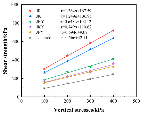 According to the stress-strain curve obtained from the shear test (Figure 9), the shear strength (Table 5), the internal friction angle, and cohesion (Table 6) of granite residual soil are obtained. It can be seen from the table that a significant improvement in the shear strength of soil solidified with five methods was achieved. The group JR under the same vertical stress shows a maximum cohesion of shear strength of 167.59 kPa and an internal friction angle of 54.15°. These values are 101.75% and 297.98% higher than the uncured group (cohesion: 42.11 kPa, internal friction angle: 26.84°). The lowest degree of improvement in the strengthening effect is group JPY, with the cohesion and internal friction angle increased by 14.42% and 122.51%, compared with the uncured soil. It can be seen that microbially induced CaCO3 precipitation can effectively bond soil particles, fill the space between soil particles, increase the surface’s roughness, improve the sample’s integrity and enhance the friction resistance. Further comparison between the test group of one-time grouting and multiple grouting revealed that multiple grouting with peristaltic pump increased the cohesion by 55.03% and the internal friction angle by 44.86% compared with one grouting. The cohesion increased by 34.79%, and the internal friction angle increased by 53.74% when the air compressor was used for multiple grouting compared to a single grouting. The effectiveness of multiple grouting’s strengthening is significant due to the increase in the number of bacteria on the surface or between soil particles with each injection of bacterial liquid. This promotes the precipitation of calcium carbonate between soil particles, resulting in a more apparent bridging effect between soil particles [31]. The cohesion increase of air compressor grouting is lower than that of peristaltic pump grouting, but the friction angle increase is greater. This is due to the fine-grained soil sinking to fill the bottom gap under the air pressure, which affects bacterial adhesion and cementing fluid injection, resulting in a lower adhesive force after soil sample solidification. However, the consolidated soil with coarser particles is formed in areas except for the bottom. The interlocking effect between soil particles and the surface friction and the connection bite force between them are improved. Figure 10 presents the relationship curve between the shear strength and normal pressure of granite residual soil under different normal pressures. The figure demonstrates that the curing effect of groups JPY, JKY, and JRY mainly enhances cohesion. The soaking method used in the group JPY resulted in a one-dimensional surface consolidation, which prevented the bacteria and cementation liquids from entering the soil and forming a complete consolidation body. Groups JKY and JRY had limited bacterial adsorption due to a one-time injection, which affected the amount of calcium carbonate between the soil particles and failed to form a complete consolidated body. The cohesion and friction angle of groups JR and JK are significantly improved, especially in group JR; the peristaltic pump grouting has little disturbance on soil samples and is most effective for transporting colony and cementing fluid into the lower soil mass, with the best consolidation effect.