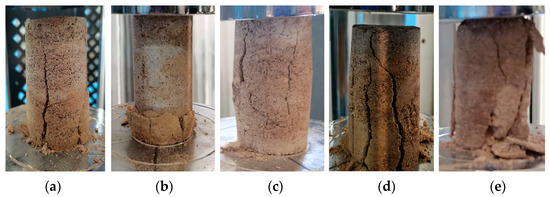 UCS test failure mode of samples: (a) JR; (b) JK; (c) JRY; (d) JKY; (e) JPY.