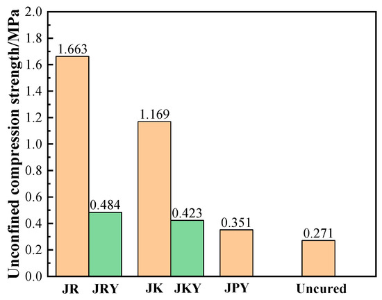 The results presented in Figure 12 indicate that the UCS of group JR reached a maximum of 1.663 MPa, which is 513.65% higher than the uncured group (0.271 MPa). On the other hand, group JRY only achieved a strength of 0.484 MPa, which is significantly lower than group JR, which underwent multiple injections of bacteria, confirming the shear test phenomenon. The air compressor grouting mode showed the second-best strengthening effect, while the JK group with multiple grouting also demonstrated a better effect, with a strength increase of 331.37%. Despite multiple attempts at grouting, the strengthening effect of the bottom soil has been poor due to the sinking of fine particles caused by air pressure. This destroyed the bottom soil sample before the upper soil reached the ultimate bearing capacity. The strengthening of group JPY only affected the surface soil, resulting in a weak UCS of only 0.351 MPa, with the lowest increase.
