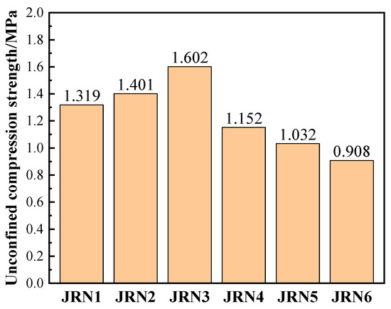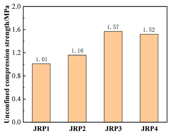 The UCS test revealed significant variations in failure forms of soil samples with different strengthening methods, as depicted in Figure 11. The group JR exhibited a typical tensile failure, with cracks running through the whole sample column from top to bottom, similar to the uniaxial compression failure mode of brittle materials [32]. In group JK, the soil bottom was partially broken, and an obvious weak strengthening area was observed. Groups JRY and JKY showed multiple fracture surfaces, indicating the presence of several weak points in the test piece. Group JPY resulted in an overall fracture, with the internal soil not consolidated together, except for the massive exfoliated soil on the surface of the test piece.