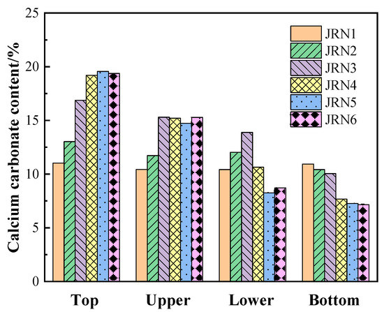 During the process of grouting solidification, it was observed that an increase in cement concentration resulted in earlier one-dimensional calcium carbonate deposition in some groups, leading to the early termination of the test. Specifically, group JRN6 terminated at the third round of bacterial fluid injection failure, group JRN5 terminated at the third round of cementing fluid injection failure, and group JRN4 terminated at the fourth round of bacterial fluid injection. Only groups 1–3 were successful in completing the grouting process. In the UCS test, groups 1–3 exhibited typical tensile failure, while groups 4–6 showed a more serious one-dimensional phenomenon, with sample failure resulting from weak yield at the bottom. When comparing groups 1, 3, and 5, which had the same concentration of urea and calcium chloride, it can be seen from Figure 14 that group 3 had the highest strength of 1.602 MPa, followed by group 1 with 1.401 MPa, and group 5 had the lowest strength of 1.032 MPa due to incomplete grouting. According to the calcium carbonate content determination results in Figure 15, it can be observed that group 3 has the highest calcium carbonate content, with an even distribution from top to bottom, namely 13.0, 11.72, 12.06, and 10.42%. On the other hand, group 1 shows the most uniform distribution of calcium carbonate, with values of 10.7, 10.43, 10.42, and 10.93%, respectively, although the total amount is slightly lower. Meanwhile, group 5 has a relatively high total content, but the calcium carbonate content in the upper and lower parts exceeds 10%, which results in an apparent one-dimensional grouting problem. The results indicate that a lower concentration of cementing fluid leads to a slower consolidation rate of the upper sample. This is beneficial for the complete consolidation of deep soil samples. As the concentration of the cementitious solution increases, the distribution of calcium carbonate in the sample gradually appears as high in the upper part and low in the lower part until severe one-dimensional transformation occurs [34]. The grouting scheme of the first group has the potential for further strength improvement with a continuous increase in grouting times, making it suitable for sites requiring deep slope reinforcement. However, this also means higher reinforcement costs. The third group of grouting schemes is recommended for consolidating surface soil up to a depth of 20 cm. Only groups 1 and 2 showed better reinforcement effects when the urea concentration was twice that of the bacterial solution. It can be seen that when the concentration is low, better strengthening effects can be achieved by increasing the concentration of cemented urea. However, there will be a problem of one-dimensional solidification with high concentration, such as in groups 4 and 6.