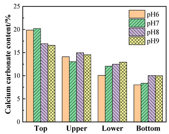 The grouting effects vary depending on the concentration of cementing fluid and the pH value. Group 1, with a pH value of 6, was blocked during the third round of grouting, while group 2 failed during the fourth round. Groups 3 and 4 were successful in completing five rounds of grouting. The strengthening soil samples of groups 1 and 2 yielded at the bottom first. The third and fourth groups exhibited typical tensile failure as cracks appeared from top to bottom. As shown in Figure 16 and Figure 17, group 3 has the highest strength and average calcium carbonate content, followed by group 4. The strength of group 3 is 1.549 MPa, which is 0.18% higher than that of group 4 (1.522 MPa), while the average calcium carbonate content of group 3 is 54.39%, which is 0.08% higher than that of group 4 (54.04%). It can be concluded that the calcium carbonate content significantly affects the strength growth. The lowest UCS is group 1, which is only 1.009 MPa. The rapid blockage of the grouting mouth in this group indicates fast mineralization sedimentation. Nevertheless, previous studies suggest that the influence of pH values of 6–8.5 on urease activity can be almost ignored [35]. Therefore, if the concentrations of bacterial solution and cementation solution are equal, calcium ions are easily adsorbed onto bacterial surfaces in acidic and neutral environments. This will promote the deposition of calcium carbonate rapidly. However, in an alkaline environment with a pH of 8–9, the calcium source exists in the form of an emulsion, which slows down the rate of mineralization deposition. Additionally, when the pH is greater than 8.5, the activity of urease is inhibited to some extent. As a result, for group 3 with a pH of 8, grouting has the most favorable effect.