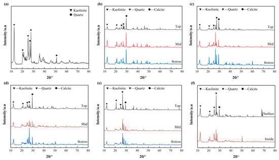 Calcium carbonate occurs in various crystal forms, including calcite, aragonite, and vaterite [36]. Among these, calcite is the most stable of the three crystal forms, and the crystal shapes are mainly plate and cube. The samples before and after the curing of MICP were analyzed by XRD. It can be seen from Figure 18 that the soil samples before solidification are mainly composed of kaolinite and silica. After solidification, it was found that only the internal soil samples consolidated with the soaking method did not exhibit a characteristic peak for calcium carbonate. This is because these samples were not effectively consolidated. On the other hand, the remaining groups of samples showed calcite characteristic diffraction peaks in the range of 29.4–29.6°. The samples that were strengthened with multiple injections of bacteria into a peristaltic pump and air compressor show a significantly higher characteristic diffraction peak for calcite compared to those that were strengthened with a single injection of bacteria. This indicates a notable significant difference in the amount of calcium carbonate precipitation produced by the two consolidation methods.