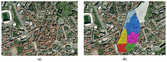 Historic city center of Guimarães: (a) Study area; (b) Criticality zones of study (Zone 1—White area; Zone 2—Blue area; Zone 3—Pink area; Zone 4—Green area; Zone 5—Red area; Zone 6—Yellow area; Zone 7—Light Blue area.