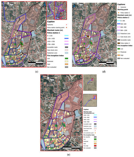 Mapping of the crisis management vulnerability and the Fire Inception Index. Distance from the emergency services to the city center and possible accessibility routes (a) Firefighters, (b) Hospital, (c) Public Security Police, (d) Municipality Police, and (e) Civil Protection.