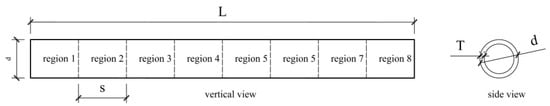 An X52Q grade high-strength seamless steel pipe specimen tested by Qin [] was employed herein to validate the numerical model. The specimen was uniformly divided into eight pitting regions along the length dimension. The geometry of the specimen is shown in Figure 1 and Table 1, where the slenderness ratio , which means the ratio of the calculated length of the specimen to the radius of gyration of the specimen section, controls the length of the specimen. Only pitting corrosion in one region was investigated herein. According to the division of eight local pitting regions, when the pit was generated in each section, it was necessary to guarantee that pits did not exceed the boundary. Thus, the coordinates of pits are constrained by Equation (9), where are the coordinates of the pits, is the diameter of pit, and is the region number. Furthermore, pits cannot be stacked, which is constrained by Equation (10), where is the angle under polar coordinates, is the distance between two pits, and is sum of the radius of two pits. The conversion of polar and rectangular coordinates can be calculated by Equation (11).