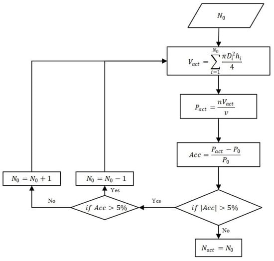 The pitting database was composed of different arrays of pit parameters. The data structure of the pitting database was , where is the region number. When proposing the database, specimen size, corrosion rate, and corrosion time were initially determined. Table 2 shows the initial parameters. What needs to be explained is , which is defined as the volume ratio of pitting to its corrosion region. The geometry parameters were defined in Section 2.1. The corrosion rate and time t are ladder-value, which are shown in Table 3. Then λ can be calculated by Equations (6) and (7). is just an initial value of calculation that needs to be adjusted to obtain the number of the actual pits . can be calculated by defining an initial corrosion depth , multiplying it by the diameter-to-depth ratio λ to obtain an initial pit volume , and finally calculating using the corrosion rate. The calculated method of is determined by Equation (12), where is the volume of the specimen, and is the assumed corrosion depth, which was determined after many attempts. Afterward, the depths and diameter of pits can be calculated by Equations (4) and (8), where is randomly selected as times in (0,1). Figure 2 shows the adjustment from to . Finally, the coordinates of pits can be generated using the method in Section 2.1.2 and the corrosion database can be completed.