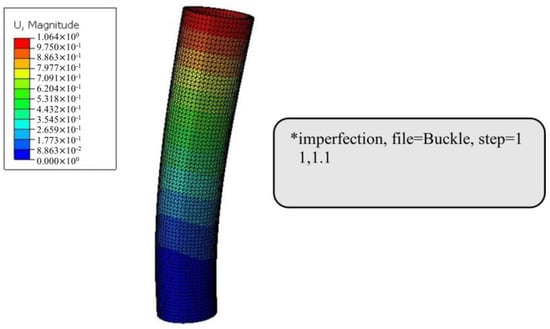 ABAQUS was used to conduct FE modeling and analysis of non-pitting specimens. Considering material elastic–plastic and geometric nonlinearity, the real stress was calculated by Equations (13) and (14), where , , , and are the initial length, the initial area, the length, and the area after loading of the specimen, respectively. Figure 7 describes the real stress–strain relationship compared with the nominal one. The element type was C3D10. Boundary conditions were set at the bottom surface of the model where the displacement of U1, U2, and U3 was 0. Kinematic coupling was set to connect the concentric point of the top surface, and the displacement of the coupling point in the U1 and U2 directions was 0. The point force was loaded at the coupling point, as shown in Figure 8. Considering the initial imperfection, the displacement of nodes under the first-order buckling mode of the specimen was imported to the subsequent nonlinear buckling analysis model, which is described in Figure 9. To make a full comparison, Qin’s study [] was also cited as a reference.