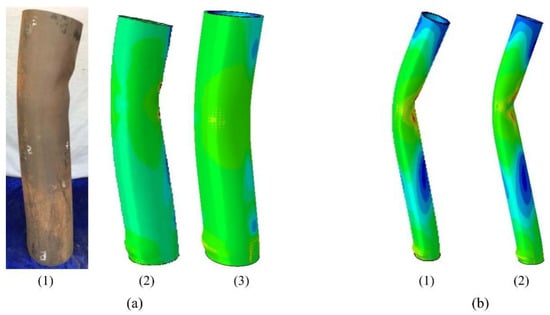 Deformation of the specimen. (a) λ = 12.22, (1) Experiment [], (2) Qin’s FEM result [], and (3) FEM result of this paper; (b) λ = 25, (1) Qin’s FEM result [], and (2) FEM result of this paper.