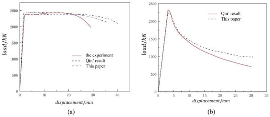Figure 10 shows the deformation mode of the specimen under the load condition. The deformation pattern was highly consistent with the experiment mode and Qin’s result. The ultimate strength is shown in Table 5, and Figure 11 shows the displacement curve. According to the deformation mode, the ultimate strength, and the displacement curve, the FE model showed a high concordance with the experiment, proving that the FE model proposed in this paper was reasonable and accurate. Thus, the following FE analyzing results could be trusted with reasonable accuracy.