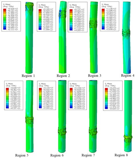 Using the methods proposed in Section 2, local random pitting models in which = 25 were employed, and the ultimate strength of the models was calculated with the method in Section 3.1. Figure 12 shows the deformation modes of the models where local pitting was randomly generated in regions 1~8. Considering the randomness of the size and the location of the pits, the lower limit of ultimate strength in a 95% confidence interval was taken as of the specimens corresponding to each pitting corrosion rate and corrosion region. Figure 13 shows the regression results of the variation trend of using the least-squares method with variable in different corrosion regions.