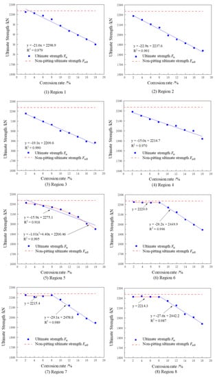 For region 5, showed a secondary parabolic decreasing trend with the increase in , with = 0.995. For regions 6–8, remained constant when corrosion rate < 8%, which meant the low had little effect on when pitting occurred in regions 6~8. decreased linearly with the increase in when > 8%, with > 0.987. The slope of the fitted results took values in the range [−29.1, −27.6] with a mean value of −28.3, and the intercept took value in the range [2442.2, 2458.5] with a mean value of 2450.3. The variation coefficients = 2.7% and = 0.3% showed a high trend consistency. This paper holds that the decrease in the ultimate strength of the specimen was caused by the stress concentration and section weakening caused by pitting corrosion. With the increase in pitting corrosion rate, the influence of stress concentration on ultimate strength was less sensitive than that of section weakening.