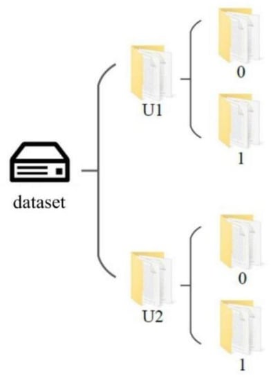 Figure 15 shows the diagram of the dataset, where U1 and U2 represent the dimension of X and Y, respectively, and the numbers 0 and 1 indicate the judgment of damage to the specimen. The data volume of the dataset was 5376 with the same number of damaged and undamaged specimens. The vibration mode data had a dimension of 9 6 after normalization and standardization using the Z-Score method. To ensure this, the vibration features learned by the CNN were not only applicable to the training set but also to the validation set, and the same mean and standard deviation were applied to the training and validation set when conducting the normalization and standardization.