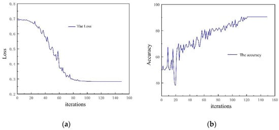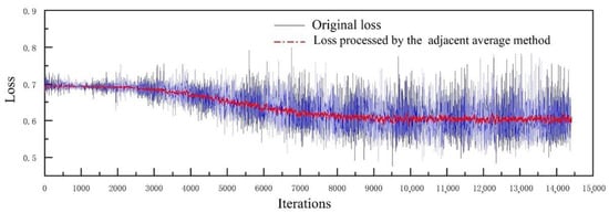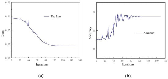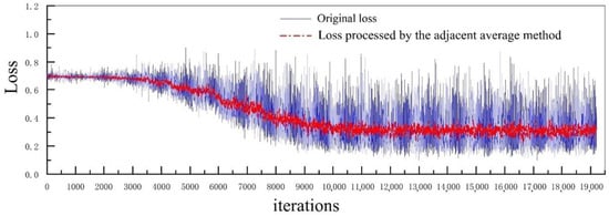 Figure 17 illustrates the loss function decrease curve of the training set. The loss began to converge after 10,000 iterations when the adjacent average method was applied. The loss of the training set decreased from 0.73 at the beginning to 0.58 at the end and gradually stabilized, which proved the training was effective. Figure 18a illustrates the loss of the valid set, with the loss decreasing from 0.69 at the beginning to 0.59 at the end. It can be observed that the loss of training and validation both decreased in a lower magnitude. The pitting damage determination accuracy is shown in Figure 18b, which increased from 50% to 75.5% with = 10%. It can be seen that the accuracy was low for the binary classification of damage determination, which did not satisfy the requirements for damage determination, so the network needed to be modified.