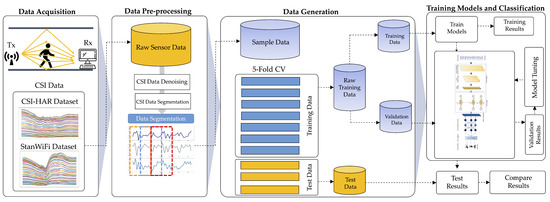 This research introduces an HAR system that utilizes a hybrid DL network called CNN-GRU-AttNet based on WiFi CSI data. The first step involves collecting raw CSI data for DL networks. The raw CSI data are pre-processed in the second step using denoising and segmentation techniques. Following that, the pre-processed CSI data are partitioned into separate training and evaluating sets utilizing a five-fold cross-validation methodology. Subsequently, the data samples undergo a process of high-dimensional embedding to generate features by employing convolutional layers and a GRU layer within the CNN-GRU-AttNet model. Finally, the system’s performance is evaluated using standard assessment techniques, such as accuracy, precision, recall, and F1-score. Figure 1 illustrates the overall organization of the framework.