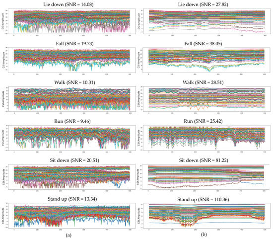 Figure 3 presents the raw and smoothed CSI signals for six human activities from the StanWiFi dataset. The visualizations reveal similar SNR results across all subcarriers of the CSI data after noise reduction using the PCA denoising method. Similar to the previous investigation, the SNR value of the denoised CSI data is higher than the SNR value of the raw data.